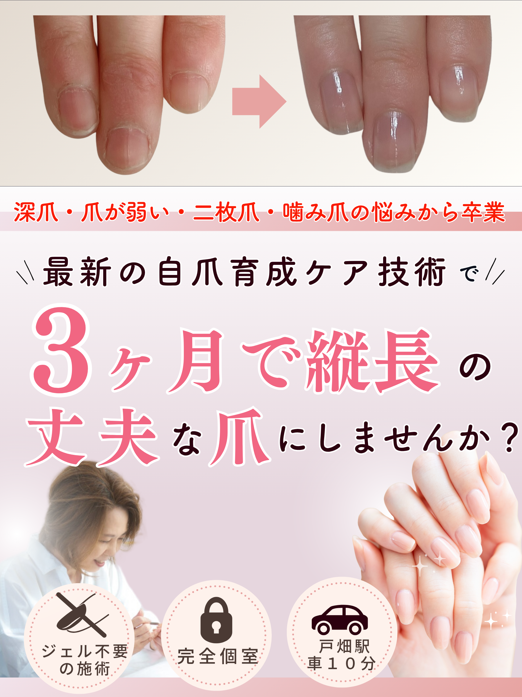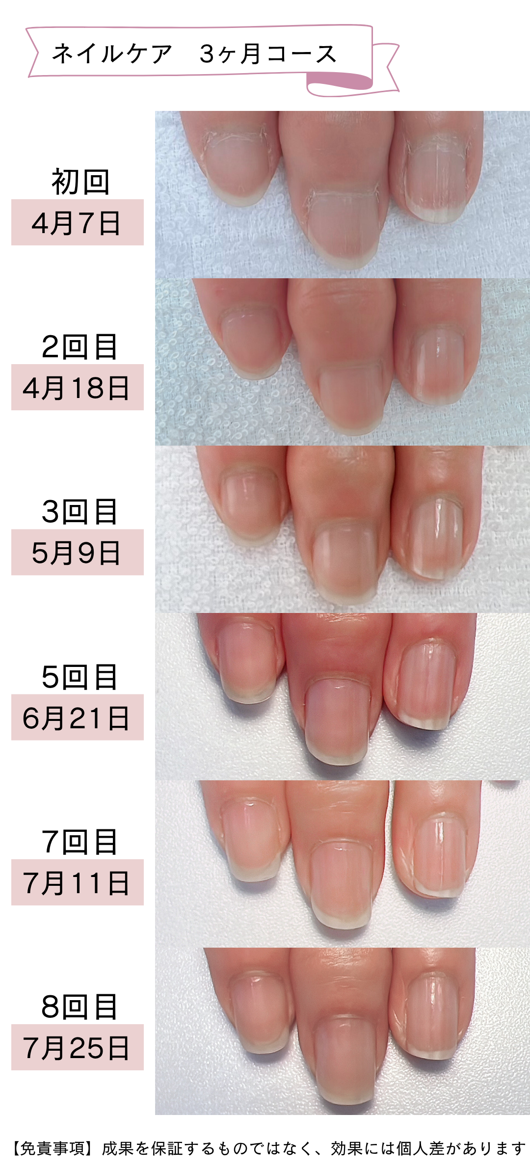 当店はお手入れだけで爪を綺麗にしていきます。爪の保護のためにベースコート(透明のマニキュア)を塗ることを推奨しておりますが、ベースコートがご使用なれない方でも爪の育成は可能です。個別に育成プランを考えてまいりますのでお気軽にご相談くださいませ。
